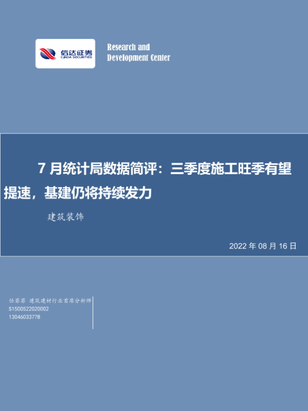 【信达证券】【20220816】建筑装饰行业7月统计局数据简评:三季度施工旺季有望提速,基建仍将持续发力-8页 行业研究
