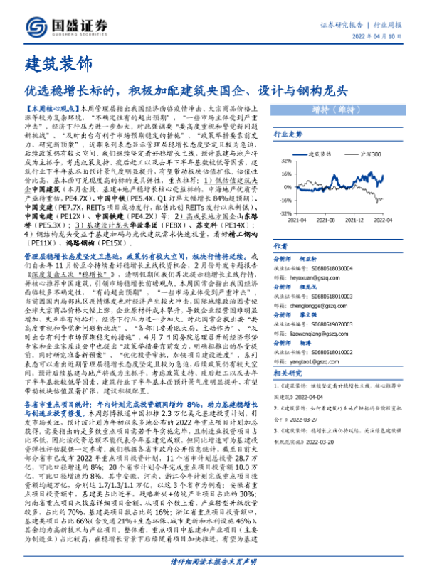 【国盛证券】【20220410】建筑装饰行业周报:优选稳增长标的,积极加配建筑央国企、设计与钢构龙头-13页 行业研究