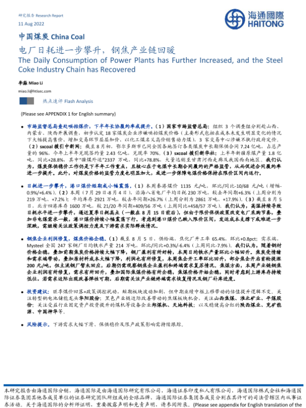 【海通国际】【20220811】中国煤炭:电厂日耗进一步攀升,钢焦产业链回暖-9页 行业研究