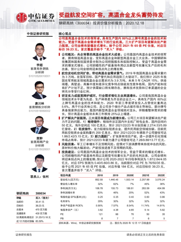【中信证券】【20201218】受益航发空间扩容,高温合金龙头蓄势待发-32页 行业研究