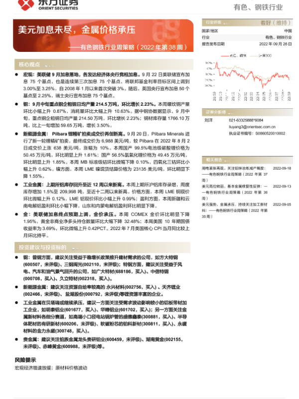 【东方证券】【20220926】20220926-东方证券-有色钢铁行业周策略(2022年第38周):美元加息未尽,金属价格承压-36页 行业研究