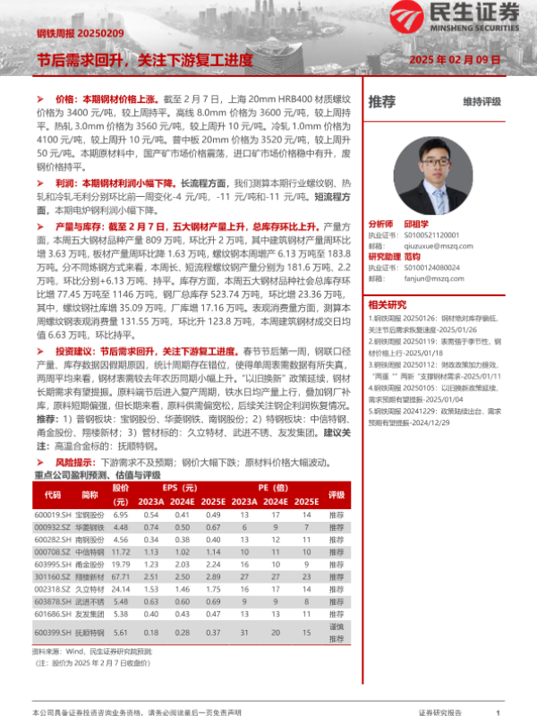 【民生证券】【20250209】节后需求回升,关注下游复工进度-20页 行业研究