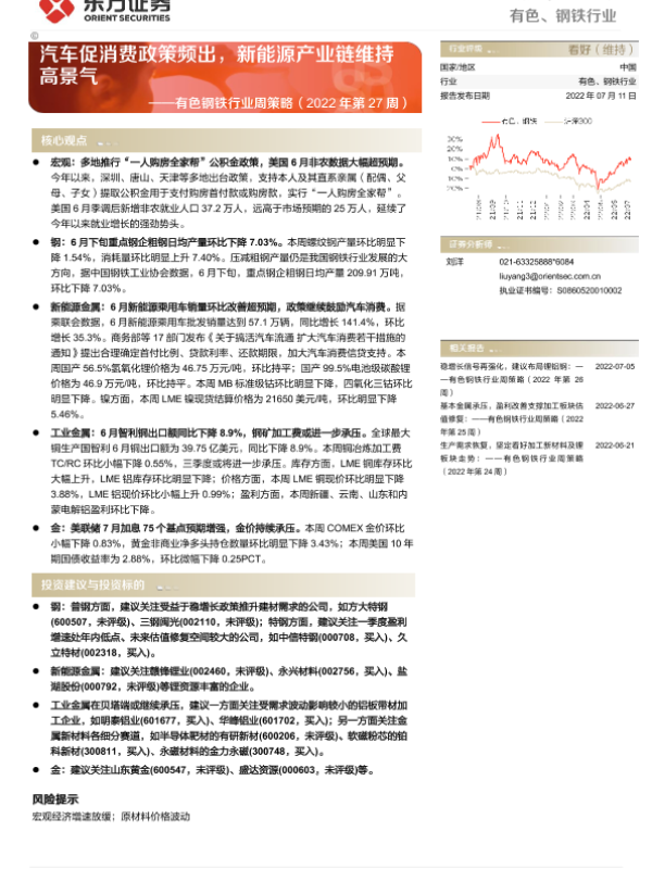 【东方证券】【20220711】有色钢铁行业周策略(2022年第27周):汽车促消费政策频出,新能源产业链维持高景气-37页 行业研究