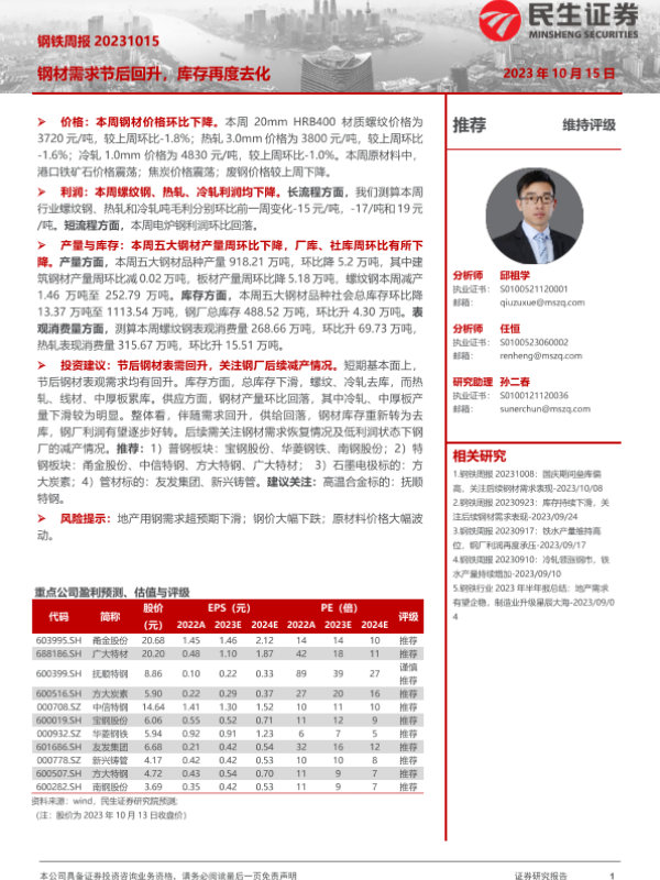 【民生证券】【20231015】20231015-民生证券-钢铁周报:钢材需求节后回升,库存再度去化-20页 行业研究