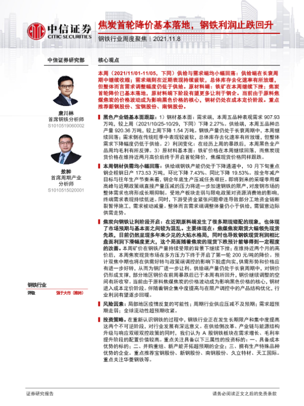 【中信证券】【20211108】20211108-中信证券-钢铁行业周度聚焦:焦炭首轮降价基本落地,钢铁利润止跌回升-12页 行业研究
