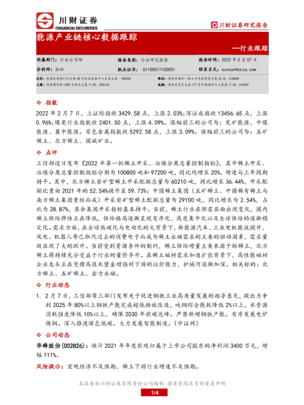 【川财证券】【20220207】能源产业链核心数据跟踪-4页 行业研究