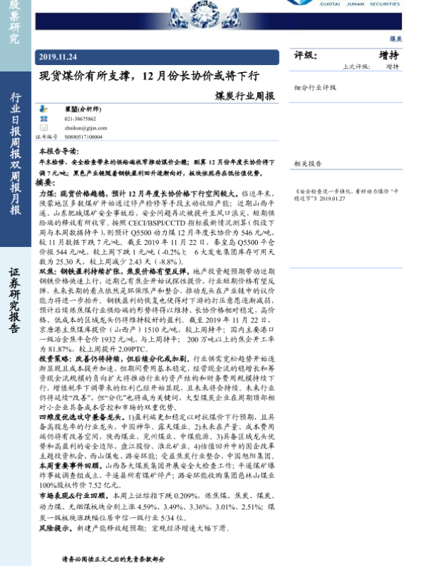【国泰君安证券】【20191124】20191124-国泰君安-煤炭行业周报:现货煤价有所支撑,12月份长协价或将下行-18页 行业研究