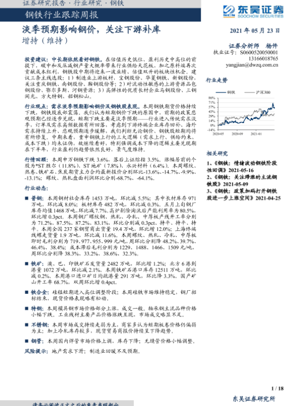 【东吴证券】【20210523】20210523-东吴证券-钢铁行业跟踪周报:淡季预期影响钢价,关注下游补库-18页 行业研究