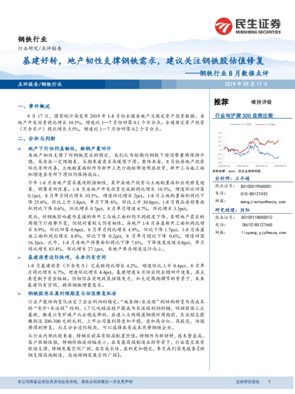 【民生证券】【20190917】20190917-民生证券-钢铁行业8月数据点评:基建好转,地产韧性支撑钢铁需求,建议关注钢铁股估值修复-4页 行业研究