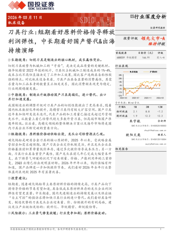 【国投证券】【202603】刀具行业:短期看好原料价格传导释放利润弹性,中长期看好国产替代&出海持续演绎-19页 证券期货研究报告