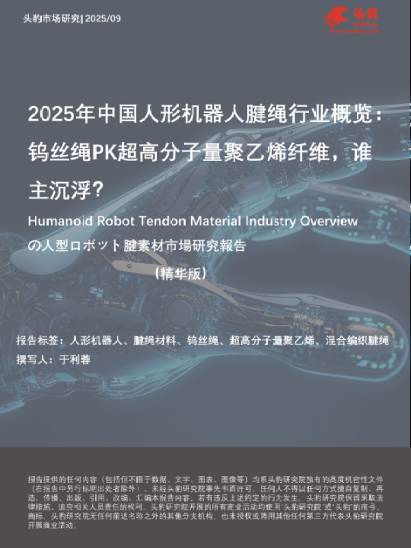 【头豹研究院】【202509】2025年中国人形机器人腱绳行业概览:钨丝绳PK超高分子量聚乙烯纤维,谁主沉浮?-16页 市场调研