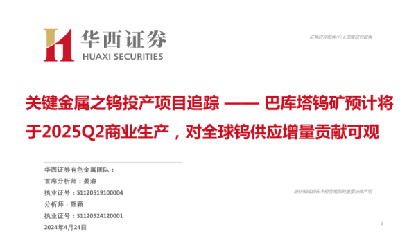 【华西证券】【20240424】有色金属行业关键金属之钨投产项目追踪-16页 证券期货研究报告