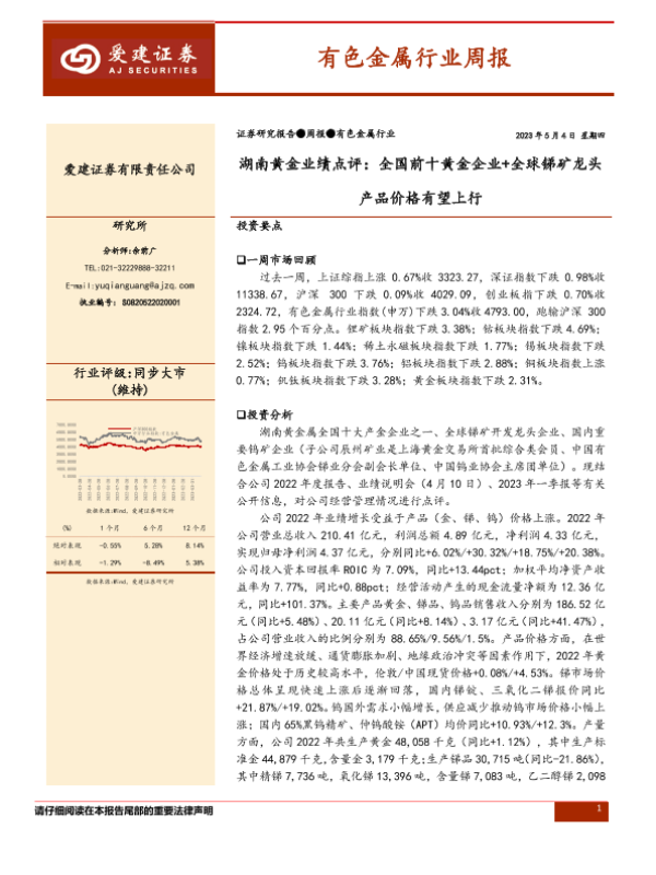【爱建证券】【20230504】20230504-爱建证券-有色金属行业周报:湖南黄金业绩点评:全国前十黄金企业+全球锑矿龙头产品价格有望上行-38页 行业研究