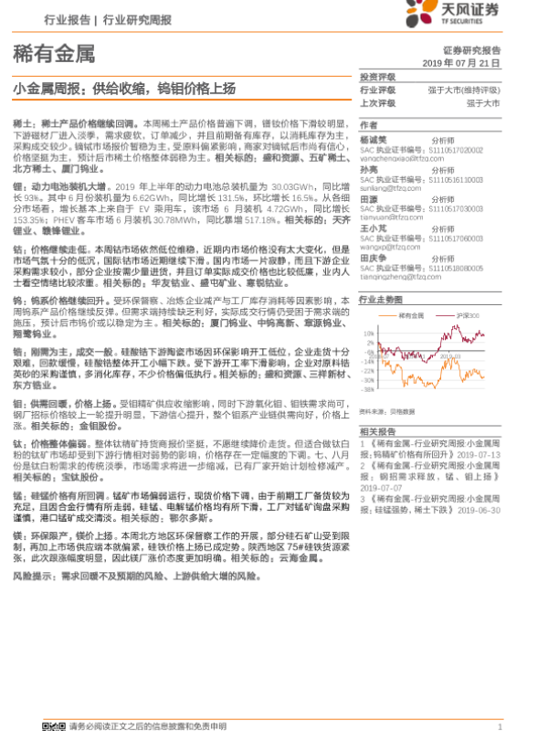 【天风证券】【20190721】20190721-天风证券-小金属周报:供给收缩,钨钼价格上扬-16页 行业研究