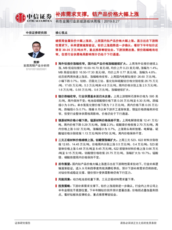 【中信证券】【20190827】20190827-中信证券-有色金属行业新能源板块周报:补库需求支撑,钴产品价格大幅上涨-14页 行业研究