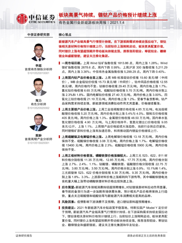 【中信证券】【20210104】20210104-中信证券-有色金属行业新能源板块周报:板块高景气持续,锂钴产品价格预计继续上涨-15页 行业研究