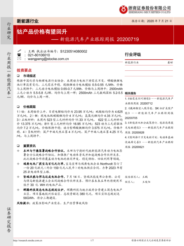 【浙商证券】【20200721】20200721-浙商证券-新能源汽车产业跟踪周报:钴产品价格有望回升-7页 行业研究