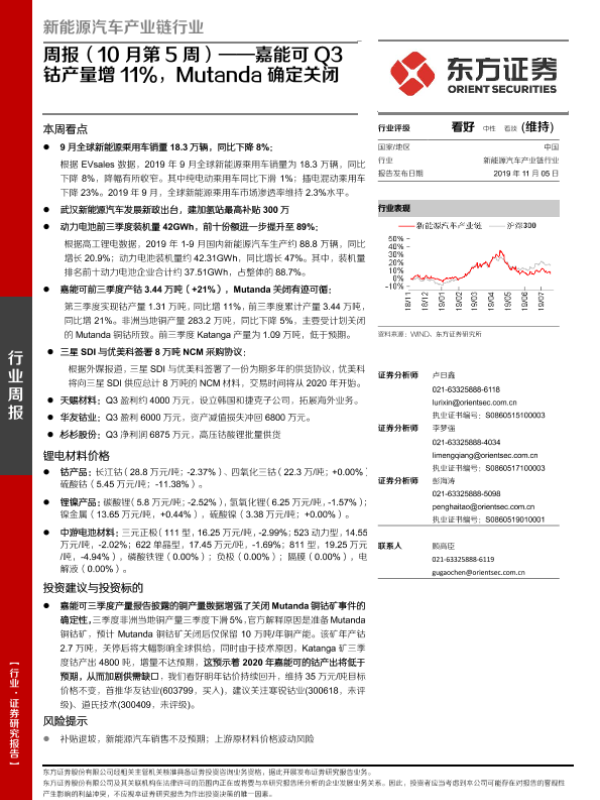 【东方证券】【20191105】20191105-东方证券-新能源汽车产业链行业周报(10月第5周):嘉能可Q3钴产量增11%,Mutanda确定关闭-22页 行业研究
