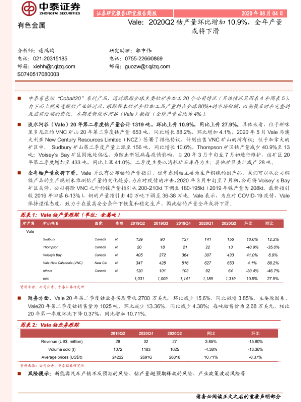 【中泰证券】【20200804】有色金属-Vale:2020Q2钴产量环比增加10.9%,全年产量或将下滑-4页 行业研究