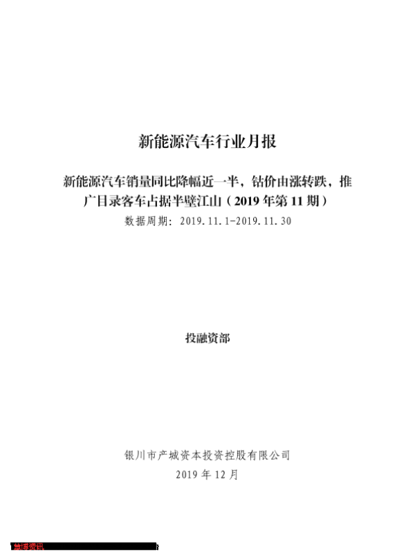 【银川市产城资本投资控股有限公司】【201912】新能源汽车行业月报(2019年第11期):新能源汽车销量同比降幅近一半,钴价由涨转跌,推广目录客车占据半壁江山-14页 行业研究