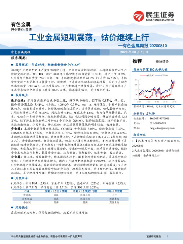 【民生证券】【20200810】20200810-民生证券-有色金属周报:工业金属短期震荡,钴价有望继续上行-18页 行业研究
