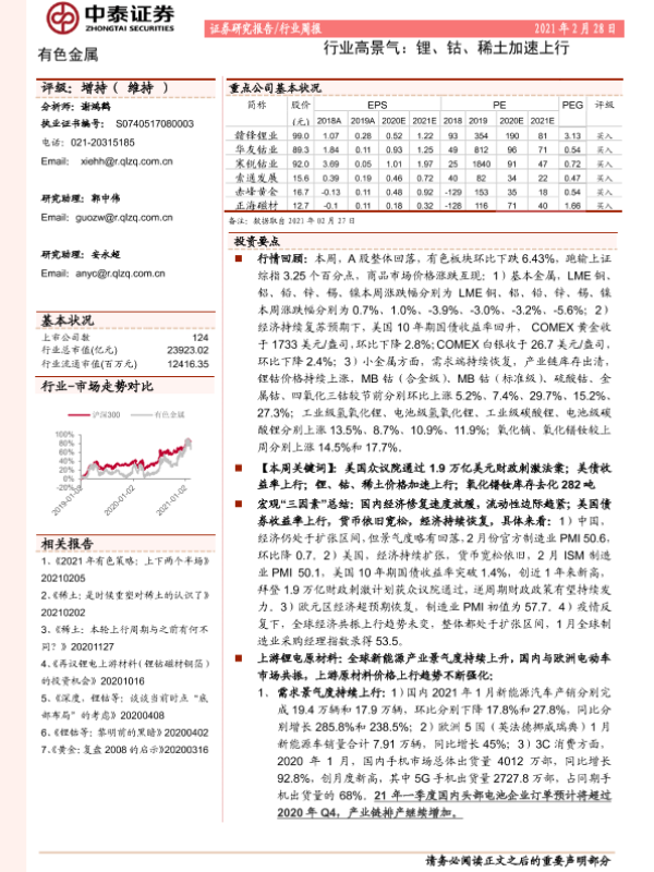 【中泰证券】【20210228】有色金属行业高景气:锂、钴、稀土加速上行-40页 行业研究