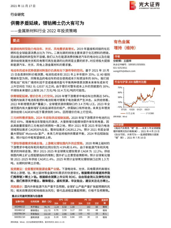 【光大证券】【20211117】金属新材料行业2022年投资策略:供需矛盾延续,锂钴稀土仍大有可为-38页 行业研究