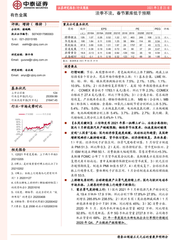 【中泰证券】【20210221】20210221-中泰证券-有色金属行业周报:淡季不淡,春节累库低于预期-39页 行业研究