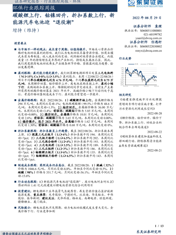 【东吴证券】【20220829】环保行业跟踪周报:碳酸锂上行,钴镍回升,折扣系数上行,新能源汽车电池迎“退役潮”-13页 行业研究