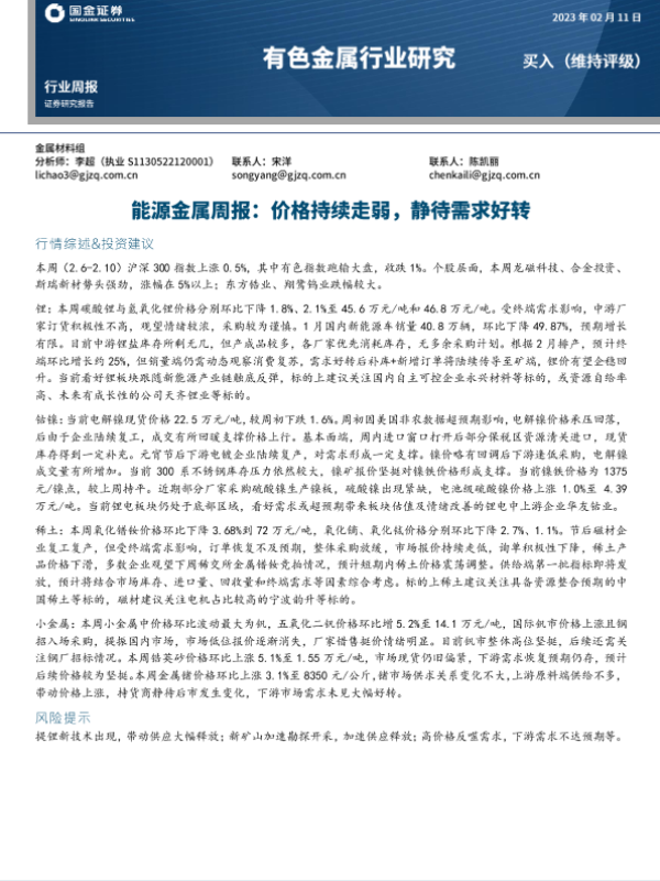 【国金证券】【20230211】国金证券-有色金属行业研究:能源金属周报:价格持续走弱,静待需求好转-16页 行业研究