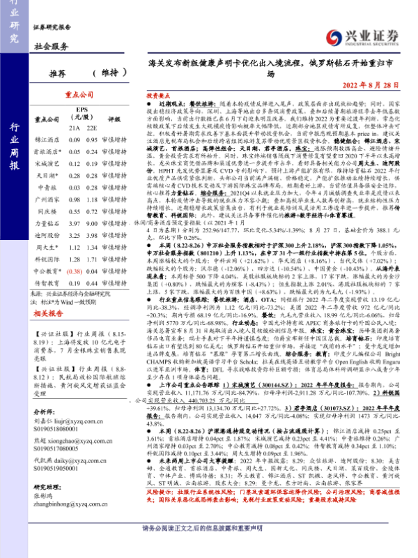 【兴业证券】【20220828】海关发布新版健康声明卡优化出入境流程,俄罗斯钻石开始重归市场-20页 行业研究
