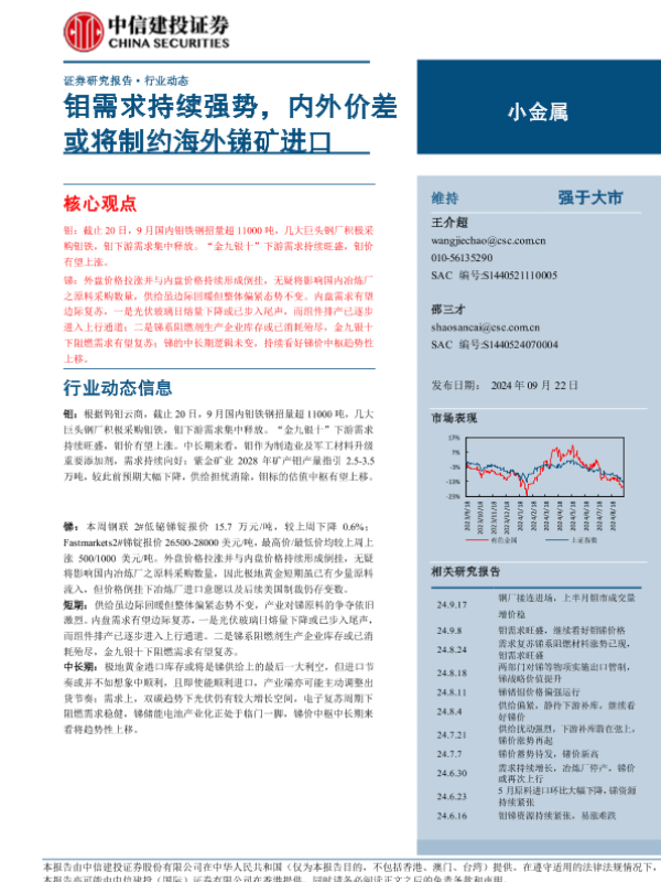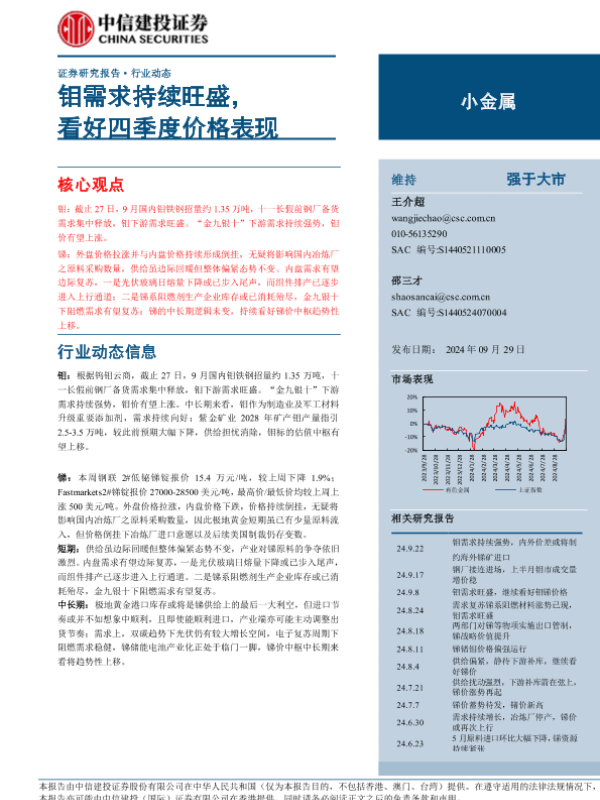 【中信建投证券】【20240917】2024年09月30日更新-【中信建投】小金属行业:钢厂接连进场,上半月钼市成交量增价稳-10页 行业研究