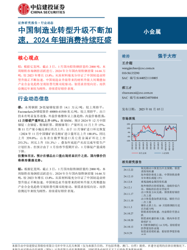 【中信建投证券】【20250105】小金属行业动态:中国制造业转型升级不断加速,2024年钼消费持续旺盛-10页 行业研究