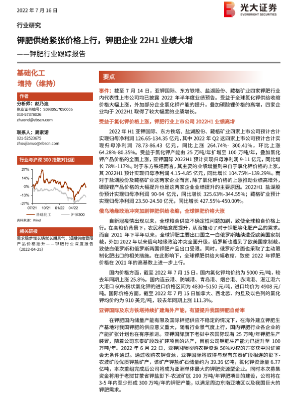 【光大证券】【20220716】钾肥行业跟踪报告:钾肥供给紧张价格上行,钾肥企业22H1业绩大增-3页 行业研究