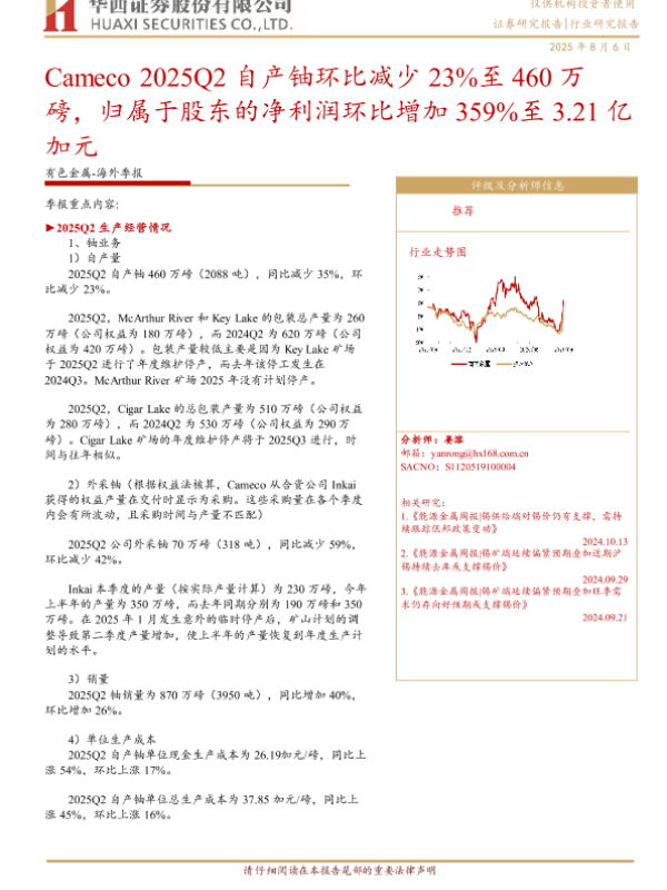 【华西证券】【202511】有色金属-海外季报:Cameco 2025Q3自产铀环比减少4%至440万磅,自产铀单位现金生产成本环比下降4%至25.2加元/磅-6页 证券期货研究报告