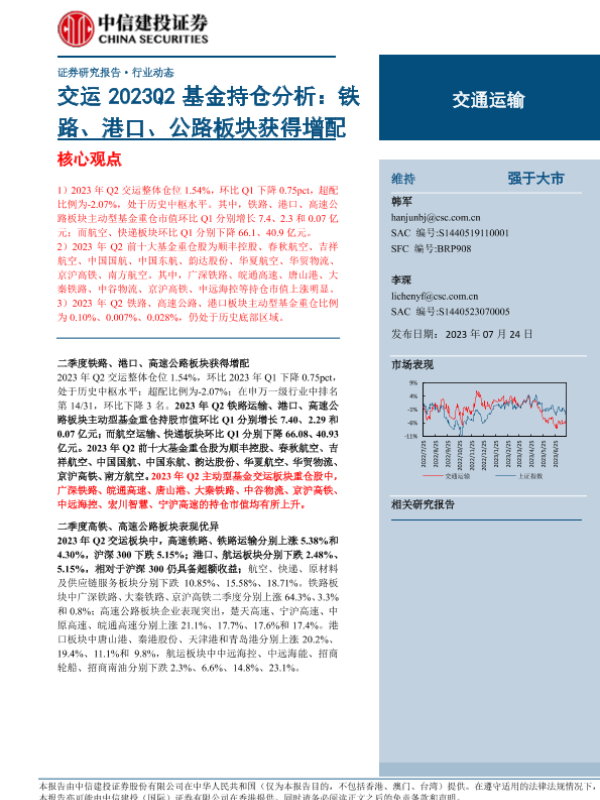 【中信建投证券】【20230724】交运行业2023Q2基金持仓分析:铁路、港口、公路板块获得增配-38页 行业研究
