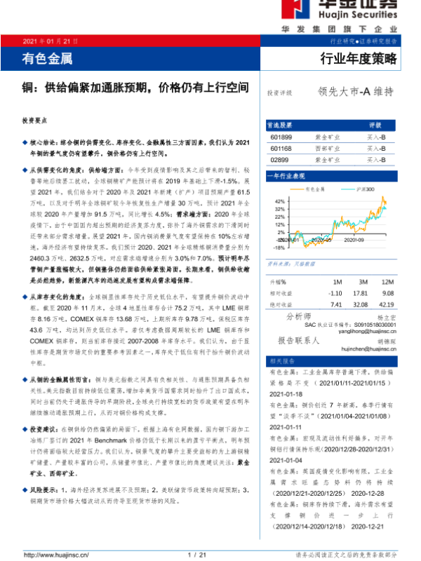 【华金证券】【20210121】20210121-华金证券-有色金属行业年度策略:铜:供给偏紧加通胀预期,价格仍有上行空间-21页 行业研究