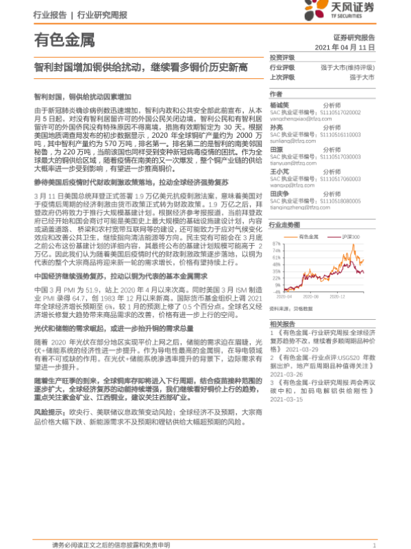 【天风证券】【20210411】有色金属行业研究周报:智利封国增加铜供给扰动,继续看多铜价历史新高-12页 行业研究