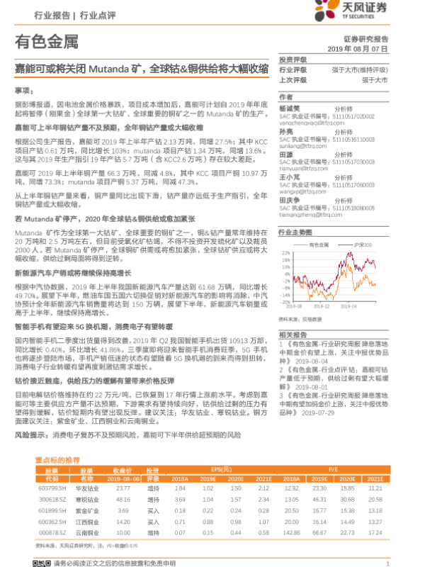 【天风证券】【20190807】嘉能可或将关闭Mutanda矿,全球钴&铜供给将大幅收缩-2页 行业研究