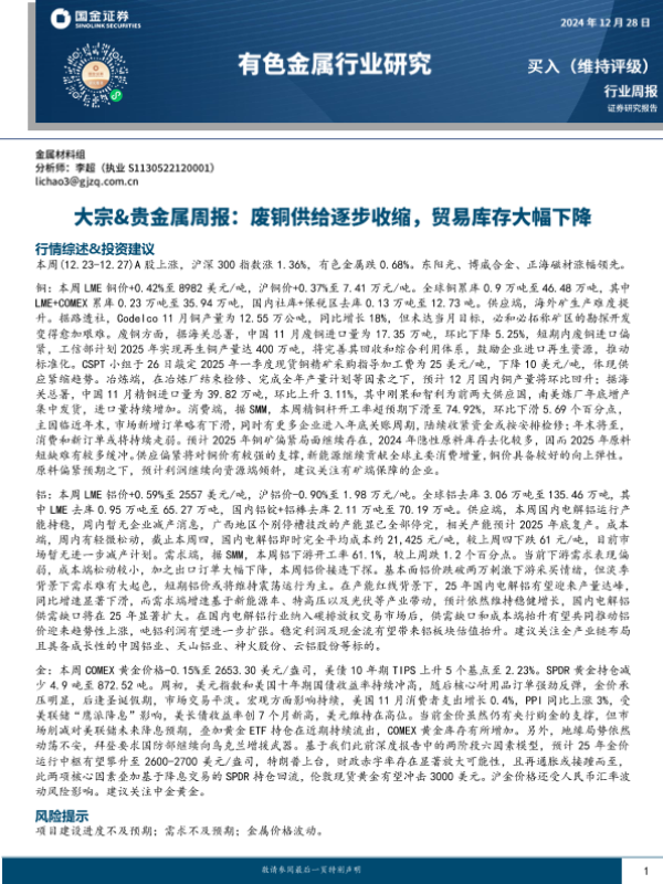 【国金证券】【20241228】20241228-国金证券-大宗&贵金属周报:废铜供给逐步收缩,贸易库存大幅下降-14页 行业研究