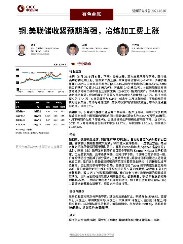 【中金公司】【20210607】铜:美联储收紧预期渐强,冶炼加工费上涨-20页 行业研究