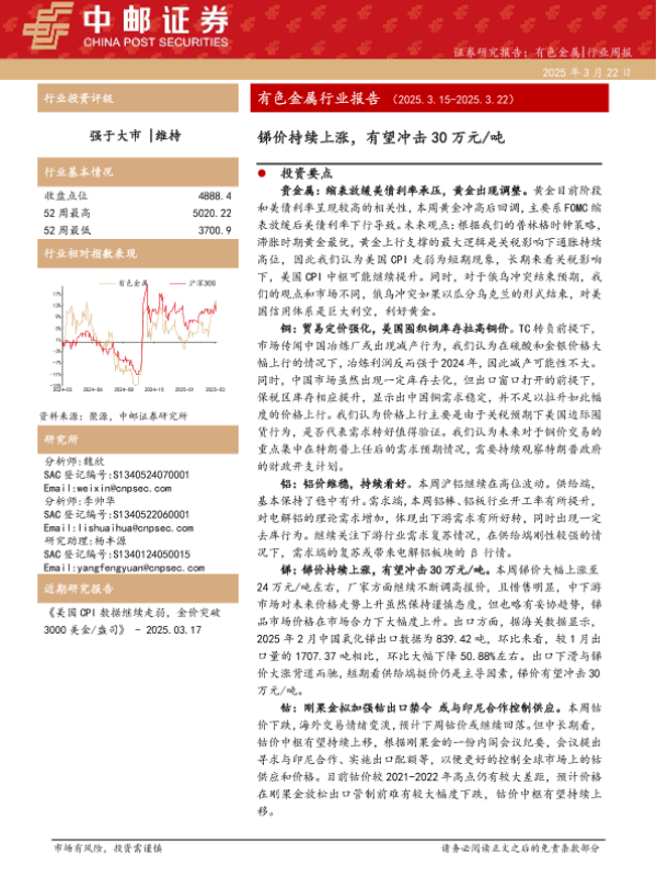 【中邮证券】【20250322】20250322-中邮证券-有色金属行业报告:锑价持续上涨,有望冲击30万元 吨-12页 行业研究