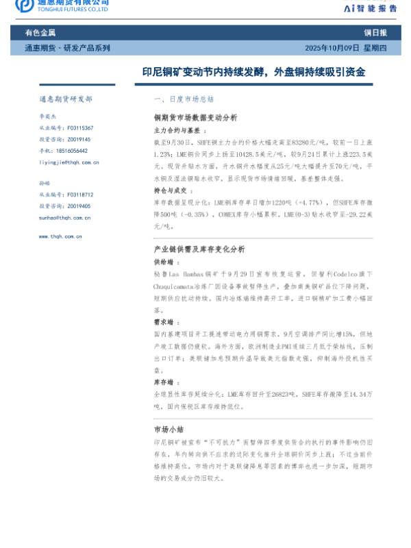 【通惠期货研发部】【202309】印尼铜矿变动节内持续发酵,外盘铜持续吸引资金-7页 证券期货研究报告