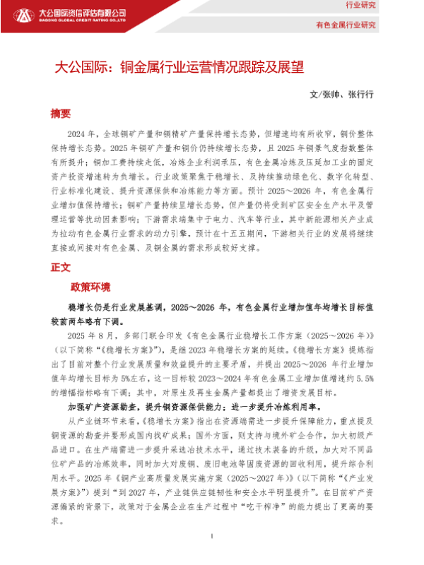 【大公国际】【2024】铜金属行业运营情况跟踪及展望-7页 行业研究