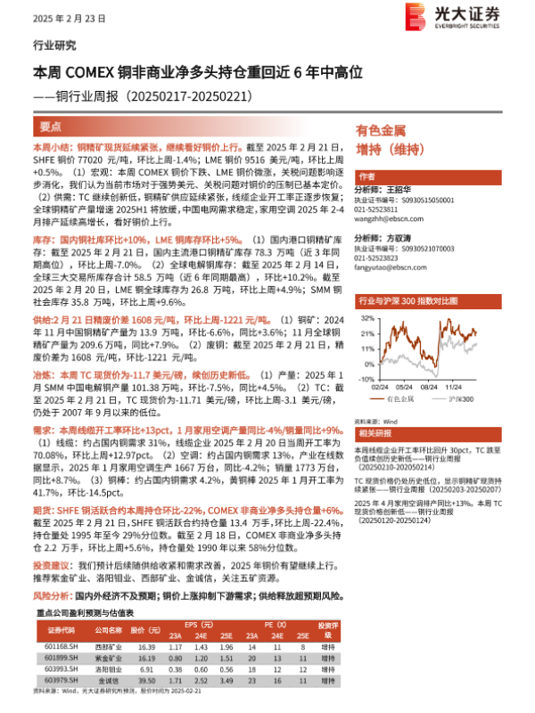 【光大证券】【20250223】20250223-光大证券-铜行业周报:本周COMEX铜非商业净多头持仓重回近6年中高位-18页 行业研究