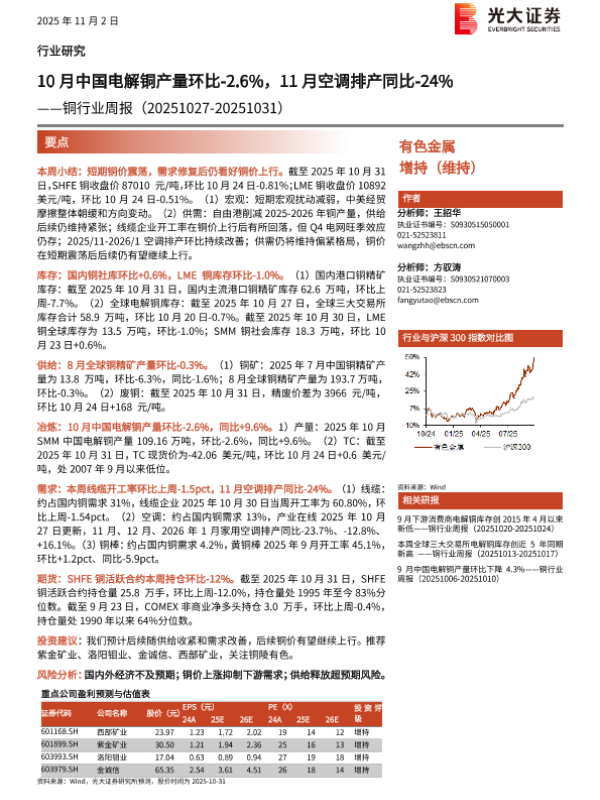 【光大证券】【202511】10月中国电解铜产量环比-2.6%,11月空调排产同比-24%-18页 证券期货研究报告