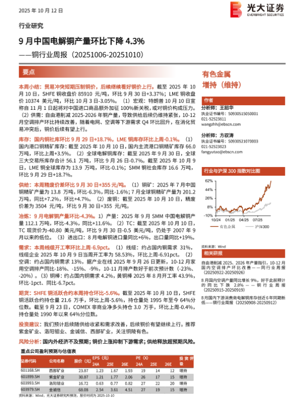 【光大证券】【202510】9月中国电解铜产量环比下降4.3%——铜行业周报(20251006-20251010)-18页 行业研究