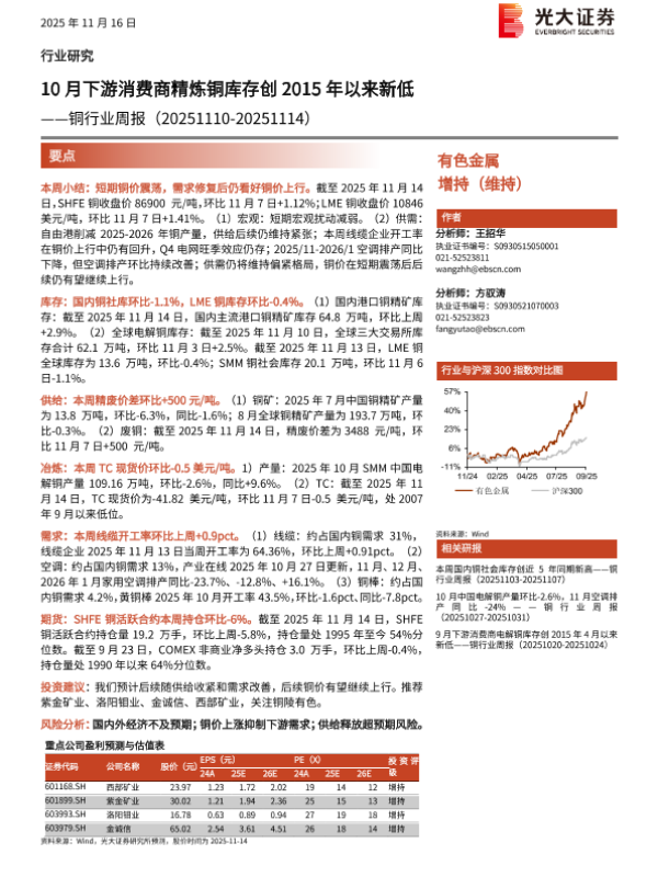 【光大证券】【202511】10月下游消费商精炼铜库存创2015年以来新低——铜行业周报(20251110-20251114)-18页 行业研究