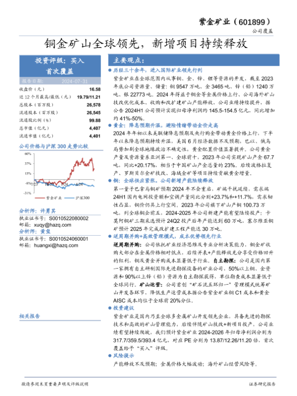 【华安证券】【20240731】紫金矿业(601899)铜金矿山全球领先,新增项目持续释放-22页 行业研究
