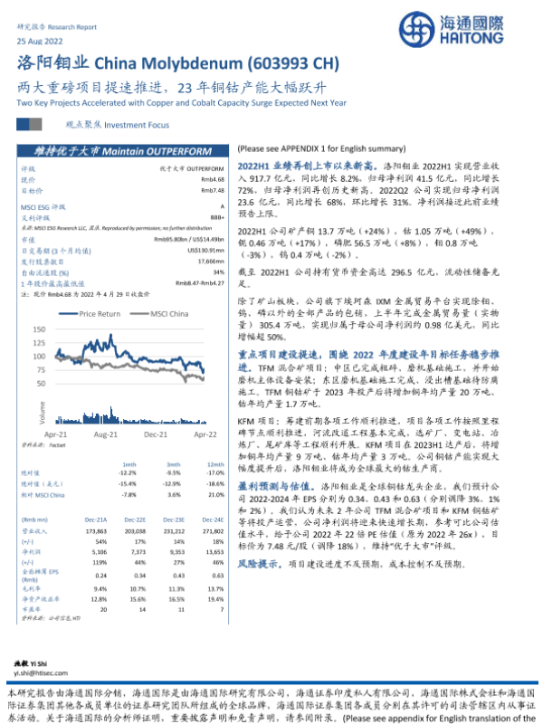 【海通国际】【20220825】两大重磅项目提速推进,23年铜钴产能大幅跃升-23页 行业研究